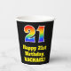 This colourful and exciting birthday themed paper cup design features a large number “21” with a rainbow spectrum gradient inspired pattern, along with the message “Happy 21st Birthday,”, and a custom name. The background is coloured black. Vibrant, colourful paper cups like this might be fun to have at a birthday celebration being held to honour somebody’s twenty first birthday. [~Z0000537]
