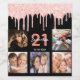 For a 21st birthday party, celebrating her life with a collage of 5 of your own photos. Personalise and add a name, age 21 and a date. Date of birth or the date of the party. White and rose gold coloured letters. Classic black background colour, decorated with rose gold, pink faux glitter drips, paint dripping look.