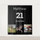 For a 21st birthday party. A collage of 3 of your photos of himself friends, family, interest or pets. Personalise and add his name, age 21 and a date. Date of birth or the date of the birthday party. Black background. White coloured text.