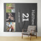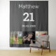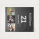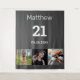 For a 21st birthday party. A collage of 3 of your photos of himself friends, family, interest or pets. Personalise and add his name, age 21 and a date. Date of birth or the date of the birthday party. Grey background. White coloured text.