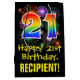 This exciting, fun, and colourful birthday giftbag design features a large number "21" with a rainbow spectrum gradient inspired pattern, along with the message "Happy 21st Birthday,", and a personalised recipient name. It also has a colourful bursting celebratory fireworks inspired background pattern. A gift bag like this might be used when giving a gift or present in honour of somebody’s 21st birthday. [~Z0000509]