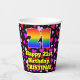 This cheerful and colourful birthday themed paper cup design features a large number “21” with a rainbow spectrum gradient inspired pattern, along with the message “Happy 21st Birthday,”, and a customisable name. The background features a pattern of pink, purple, and red heart shapes. Loving, happy paper cups like this might be fun to have at a birthday celebration/party being held to celebrate somebody’s twenty first birthday. [~Z0000548]