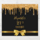Elegant, classic, glamourous and girly style birthday label. Faux gold coloured ribbon and bow with faux gold glitter dripping. Black background. With the text: 21st Birthday. Template for a name written with a modern hand lettered style script.