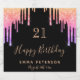 A trendy and glamourous 21st birthday label. A classic black background decorated with rainbow coloured faux glitter drips, paint dripping look in purple, pink and rose gold. With the text: 21 and Happy Birthday. Personalise and add a name and a date. Date of birth or the date of the party. Golden coloured text. Happy Birthday is written with a modern hand lettered style script.
