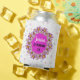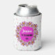 21st Birthday Celebration Can Cooler in pink, purple and gold with beautiful flower lei wreath. The words "Jessica Is Turning 21" in modern black & white text is completely customisable. So are the colours by using the edit menu.