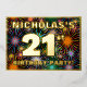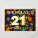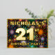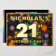 The front of this eye-catching and vibrant twenty-first birthday party foil invitation card design features a custom name, a large number “21st”, the message “BIRTHDAY PARTY!”, and a border. The background of the front has a joyful, multicolored bursting celebratory fireworks-inspired pattern. The back features personalised details about the event, such as the date, time, location/venue, and any other relevant information. Editable invitations like these might be a fun way to invite guests to a birthday gathering being held to celebrate somebody’s 21st birthday. [~Z0000602]