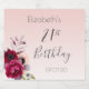 A label for a 21st birthday party. A girly and elegant soft rose gold ombre background. Decorated with dark purple, burgundy and rose pink coloured flowers. Templates for a name and a date. The text: 21st Birthday is written in dark grey with a large modern hand lettered style script.