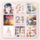 A coaster for a 21st birthday party, celebrating her life with a collage of 8 of your photos. Personalise and add a name, age 21 and a date. Date of birth or the date of the party. White and dark rose gold coloured letters. Elegant and trendy rose gold, blush pink background colour. The text: Legal and Cheers written over the photos as watermarks.