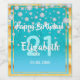 An elegant and glamourous 21st birthday wine or sparkling wine bottle label. Teal, blue green coloured faux glitter with faux diamond sprinkle and a golden frame. Templates for a name, age 20 and a date. Date of birth or the date of the party/anniversary. With the text: Happy Birthday! White and teal coloured letters. The name is written with a hand-lettered style script.