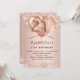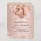 For an elegant 21st birthday. A rose gold faux metallic looking background. Decorated with rose gold, pink faux glitte, sparkles and balloons. Personalise and add a name, and party details. The name is written with a hand lettered style script, number 21 with balloon style fonts.
