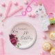 A paper plate for a 21st birthday party. A girly and elegant soft rose gold ombre background. Decorated with dark purple, burgundy and rose pink coloured flowers. Templates for a name and a date. The text: 21st Birthday is written in dark grey with a large modern hand lettered style script.