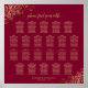 This elegant wedding seating chart accommodates up to 220 names across 22 tables with the traditional 10 seats per table. The design features a burgundy, maroon, or wine red and gold colour scheme, complemented by a script calligraphy title and decorative lacy golden faux foil frills in each corner. It's a wonderful addition to your wedding reception, offering a sophisticated and stylish way to help your guests locate their tables.