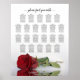 This elegant 22 table wedding seating chart features a beautiful photo of a single red rose reflecting in water with waves and ripples. The title reads "please find your table" in lacy script calligraphy. There is space for the couples' names and wedding date. This chart has table assignments for 220 guests 10 people per table.
