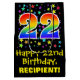 This vibrant, colourful, and fun birthday gift bag design features a large number "22" with a rainbow spectrum gradient style pattern, along with the message "Happy 22nd Birthday,", and an editable recipient name. It also has a background pattern featuring star shapes of various sizes and colours. A fun gift bag like this might be used when wrapping presents being given to somebody in celebration of their twenty second birthday. [~Z0000510]