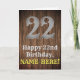 This American Wild West inspired and country look birthday greeting card design features a large rustic look number "22", the message "Happy 22nd Birthday,", a custom name, and a faux/imitation wood grain inspired look pattern background. The inside has an editable birthday greeting message, or could perhaps be cleared and left blank if a message is to be written by hand instead. An editable birthday greeting card like this might be sent in celebration of somebody’s twenty-second birthday. [~Z0000469]