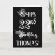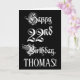 The front of this elegant and formal birthday greeting card design features the message “Happy 22nd Birthday,” in lavish script style text, on a black coloured background. The inside has an editable birthday greeting message, or could perhaps be cleared and left blank if a message is to be written by hand instead. An ornate, personalised birthday greeting card like this might be used to acknowledge somebody’s twenty-second birthday. [~Z0000554]
