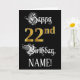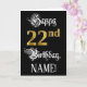 The front of this fancy and opulent birthday greeting card design features the message “Happy 22nd Birthday,”, along with a custom recipient name. Some of the message is in an elaborate script-style text. The large number “22nd” features a faux/imitation gold-inspired look pattern. The background is coloured black. The inside has a customisable birthday greeting message, or could perhaps be cleared and left blank if a message is to be written by hand instead. An ornate, customisable birthday greeting card like this might be a respectable way to send some birthday wishes to somebody who is celebrating their twenty-second birthday. [~Z0000559]