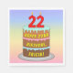 This cheerful and upbeat birthday themed paper napkin design features a cartoon-style depiction of a three-tier birthday cake having number-shaped candles on top showing the age “22“, along with the message “HAPPY 22ND BIRTHDAY,”, and a customisable recipient name. The background features a multicolored pastel rainbow spectrum inspired gradient pattern. Joyful birthday themed paper napkins like these might be used at a birthday party for somebody who is celebrating their twenty second birthday. [~Z0000623]