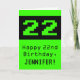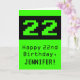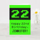 This geeky and nerdy birthday-themed greeting card design features a large green classic computer game style number "22" on the front. It also features the birthday greeting message "Happy 22nd Birthday,", and a personalized name. The inside features an editable birthday greeting message, or could perhaps be cleared and left blank if a message is to be written by hand instead. A fun and geeky birthday greeting card like this might be used to celebrate the twenty second birthday of an engineer, a computer system administrator, or somebody who appreciates vintage video games. [~Z0000430]
