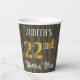 This ornate and luxurious birthday themed paper cup design features a custom name and the message “22nd Birthday Party”. The large number “22nd” features an imitation/faux gold-inspired coloring pattern, and the words “Birthday Party” are in elegant script-style text. The background features a faux/imitation woodgrain-inspired look. Fancy, opulent paper cups like this might be useful to have at a birthday celebration being held to honor somebody’s twenty second birthday. [~Z0000568]