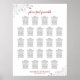 This 23 table wedding seating chart features an elegant traditional design with dark grey and crimson red text on a white background and lacy silver grey faux foil frills in the corners. The script calligraphy title reads: Please find your table. Contains table assignments for 230 guests at 10 guests per table. Sophisticated and chic way to help your guests find their seats at your reception.