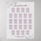 This beautiful 23 table wedding seating chart features a simple yet elegant design with cassis purple or magenta text on a grey magenta background and lacy faux foil silver floral filigree in the corners. The script calligraphy title reads: Please find your table. Contains table assignments for 230 guests at 10 guests per table.