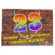 This colourful and vibrant birthday themed gift bag design, inspired by urban art, features a large number "23" having a rainbow spectrum gradient inspired pattern. It also features the message "Happy 23rd Birthday,", and a customisable name. It also has a brick wall inspired pattern background. A birthday themed giftbag like this might be a fun way to wrap a gift or present being given to celebrate somebody’s 23rd birthday. [~Z0000522]