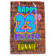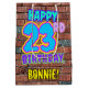 The front of this fun birthday-themed gift bag design features the message “HAPPY 23RD BIRTHDAY,” having a vibrant, colourful, graffiti and urban street art inspired appearance, along with a custom recipient name. The background features a brick wall inspired pattern. A colourful gift bag like this might be used when wrapping presents being given to somebody in celebration of their twenty third birthday. [~Z0000536]