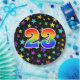 This colourful, cheerful, and fun paper plate design features a large number "23" containing a rainbow spectrum gradient inspired pattern colouring. The background features a colourful pattern of star shapes. Paper plates like this might be used when celebrating somebody’s 23rd birthday, or a couple’s 23rd wedding anniversary, or some other twenty-third event. [~Z0000493]