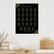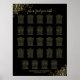 This beautiful wedding seating chart is simple yet elegant. It features a beautiful design of gold text on a black background with lacy gold faux foil floral filigree in the corners. It includes table assignments for 240 guests with 10 guests per table.
