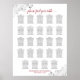 This beautiful wedding seating chart is simple yet elegant. It features a beautiful design of dark gray and red text on a white background with lacy silver faux foil floral filigree in the corners. Ornate curls and frills make the design fancy and high class. It includes table assignments for 240 guests with 10 guests per table.