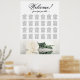 Transform your wedding reception into a luxurious affair with this captivating 24 table seating chart. The striking modern floral design showcases a single white, ivory, or cream coloured rose resting horizontally, reflecting in a tranquil pool of water. With seating for up to 240 guests and a classic layout of 10 seats per table, this chart offers ample space for your guests. The elegant calligraphic script title reads "Welcome! Please find your table," while the bottom section provides space for the couple's names and wedding date, adding a personal touch to your decor. This seating chart exudes a romantic, graceful, classy, and glamourous aura, making it the perfect way to elevate the style and class of your wedding reception while ensuring that your guests can easily find their seats.