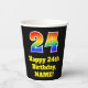 This colourful and fun birthday-themed paper cup design features a large number “24” having a rainbow spectrum gradient inspired pattern. It also features the message “Happy 24th Birthday,”, and a personalised name. It also has a black-coloured background. Vibrant, colourful paper cups like this might be fun to have at a birthday party/celebration being held to honour somebody’s 24th birthday. [~Z0000537]