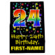 This fun, vibrant, and colourful birthday-themed gift bag design features a large number "24" with a rainbow spectrum gradient style pattern, along with the message "Happy 24th Birthday,", and a custom recipient name. It also has a colourful background pattern featuring star shapes of various sizes. A birthday themed gift bag like this might be used when giving a gift or present in celebration of somebody’s 24th birthday. [~Z0000510]