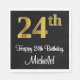 This elegant, sophisticated, and stylish birthday-themed paper napkin design features a large ordinal number “24th” having a faux/imitation gold-inspired look, along with the birthday greeting message “Happy 24th Birthday,” and an editable name in a script-style font. It also has a black-coloured background. Elegant birthday themed paper napkins like this might be used at a party celebrating somebody’s twenty fourth birthday. [~Z0000516]