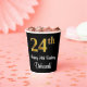 This stylish, elegant, and luxurious birthday-themed paper cup design features a large ordinal number “24th” having an imitation/faux gold-inspired gradient pattern, along with the birthday greeting message “Happy 24th Birthday,” and a custom name in a script-style font. It also has a black-coloured background. Sophisticated birthday themed paper cups like this might be used at a birthday party in celebration of somebody’s 24th birthday. [~Z0000538]