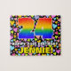 This eye-catching and colourful birthday jigsaw puzzle design features a large number “24” having a multicolored rainbow spectrum inspired gradient pattern. It also features the message “HAPPY 24th BIRTHDAY,”, and a personalised recipient name. The background features a joyful pattern of loving heart shapes with various sizes and colours. A vibrant, personalised birthday puzzle like this might be a fun way to send birthday greetings to somebody who is celebrating their twenty-fourth birthday. [~Z0000611]