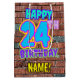 The front of this fun birthday themed gift bag design features the message “HAPPY 24TH BIRTHDAY,” having a vibrant, colourful, urban street art and graffiti inspired appearance, along with a customisable recipient name. The background features a pattern inspired by the look of a brick wall. A colourful gift bag like this might be used when giving a gift or present in honour of somebody’s 24th birthday. [~Z0000536]