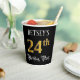 This ornate and fancy birthday-themed paper cup design features a customizable name and the message “24th Birthday Party”. The large number “24th” has a faux/imitation gold-inspired coloring pattern, the words “Birthday Party” are in elegant script-style text, and the background is colored black by default (although it can be customized). Elegant, opulent paper cups like this might be useful at a birthday celebration being held to honor somebody’s twenty fourth birthday. [~Z0000567]