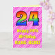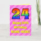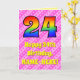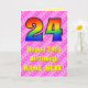 The front of this upbeat and cheerful 24th birthday themed greeting card design features a large number "24" having a colourful rainbow spectrum inspired gradient pattern. It also features the message "Happy 24th Birthday,", and a customisable recipient name. The background of the front features a fun pattern of dark pink and light pink stripes containing loving pink heart shapes. The inside features a custom birthday greeting message, or could perhaps be cleared and left blank if a message is to be written by hand instead. A customisable birthday card like this might be a fun way to acknowledge somebody’s twenty fourth birthday. [~Z0000416]