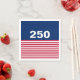 In celebration of America's 250th birthday, this paper napkin has a blue field at the top with 250 in white text. It has red and white stripes at the bottom that is reminiscent of the American flag.