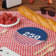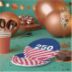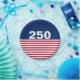 In celebration of America's 250th birthday, this paper plate has a blue field at the top with 250 in white text. It has red and white stripes at the bottom that is reminiscent of the American flag.