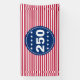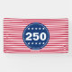 Two rows of white stars are on a blue circle. In celebration of America's 250th anniversary, 250 is in white letters are between the stars. It has red and white stripes in the background that are reminiscent of the American flag.