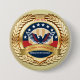 Background: The eagle is set against a circular background with a blue upper section containing white stars, and a red and blue lower section with vertical stripes.