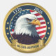 This image displays a circular, patriotic emblem featuring a bald eagle's head in the center, set against a backdrop of the American flag's stars and stripes.