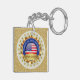 The design features a classic American flag centered within a bold royal blue ring. The medallion is framed by a brilliant gold-style sunburst and an outer ring of 20 shimmering gold stars against a textured glitter-effect border, providing a high-end, official look for your keys or bag.