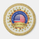 The ornament features a classic American flag centered within a bold royal blue ring. It is framed by a brilliant gold-style sunburst and an outer ring of 20 shimmering gold stars set against a textured glitter-style border, creating a high-quality, official appearance.