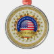 The ornament features a classic American flag centered within a bold royal blue ring. It is framed by a brilliant gold-style sunburst and an outer ring of 20 shimmering gold stars set against a textured glitter-style border, creating a high-quality, official appearance.