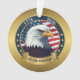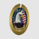 This image displays a circular, patriotic emblem featuring a bald eagle's head in the center, set against a backdrop of the American flag's stars and stripes.
