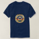 Background: The eagle is set against a circular background with a blue upper section containing white stars, and a red and blue lower section with vertical stripes.